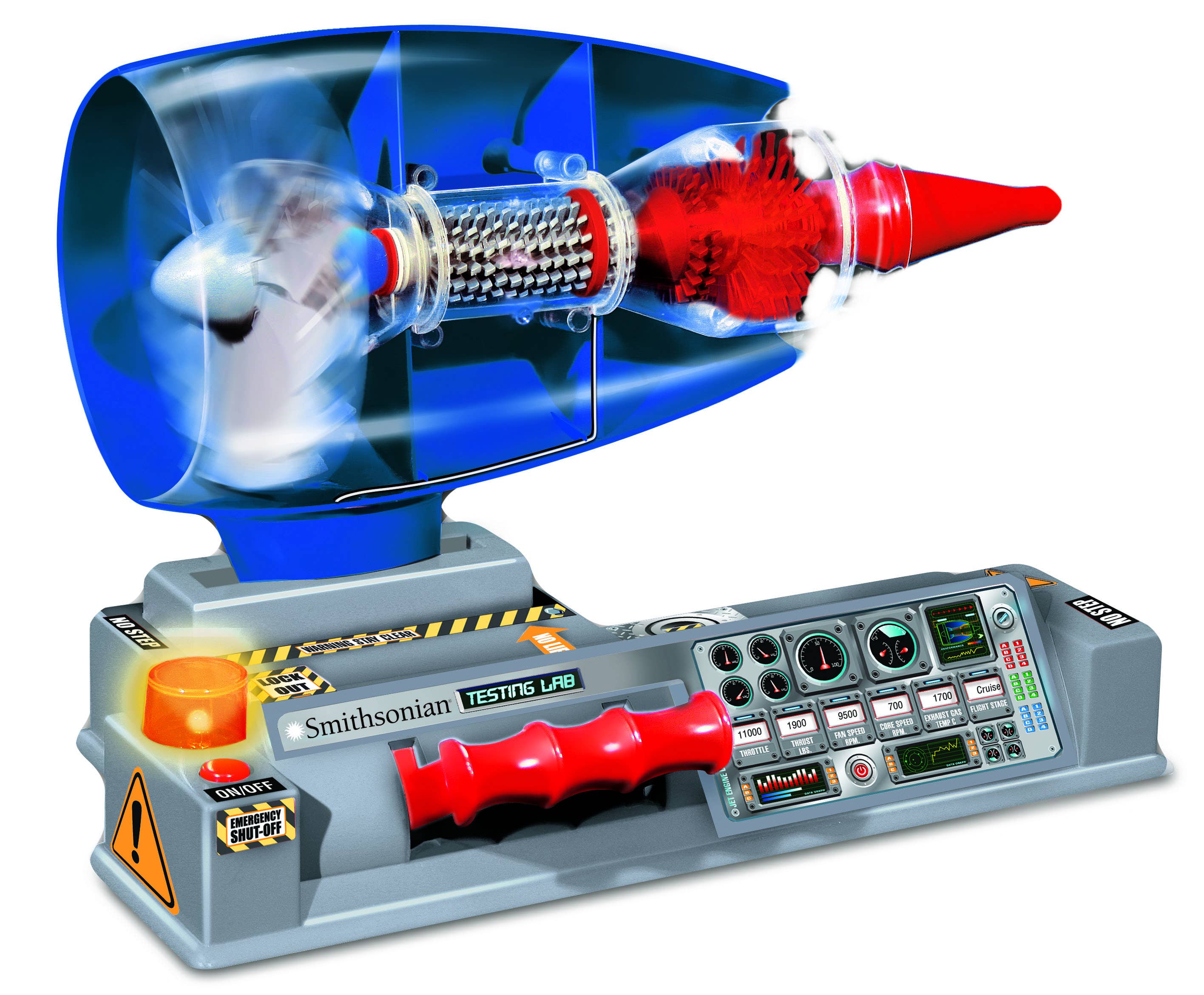 Build a working jet engine model, then wire it to a battery box and power it up. You control the thrust and turbine speed with battery-operated moving parts and lights. A color STEM poster defines basic engine terms, explains how a jet engine works, and illustrates inlet, compression, combustion, and exhaust.